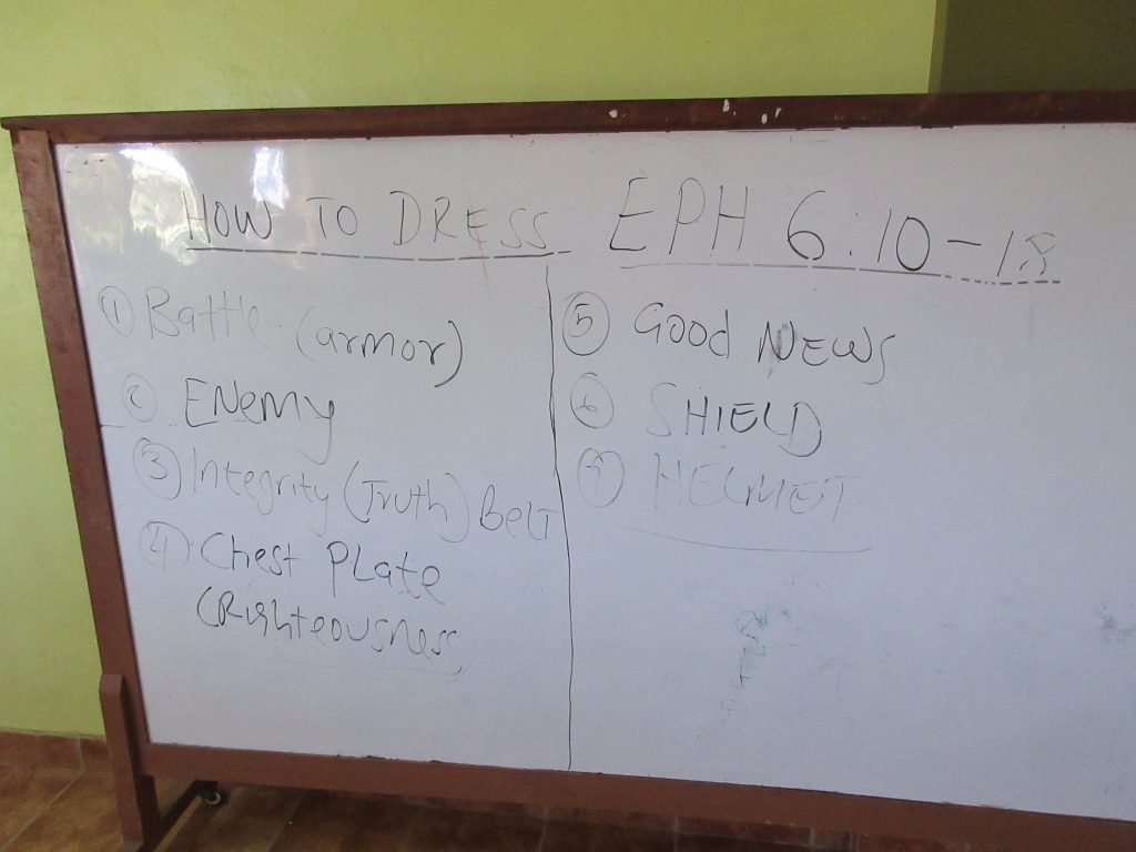 November 3 Day 7Makes me sad to write day 7 because I know it is all coming to a close on this side, at least way too soon.But need to get home to get started on 2 amazing valentine’s day events we have planned for our friends on 2/11/17.1. Hero’s Heart Valentine Magic at Kelly’s Bleachers in Big Bend from 11-2 where your little valentines can meet their hero’s – Spanish Princess and Bat-someone while at the same time being a hero for the kids in Kenya! You won’t want to miss this one – we have requests for tickets already and there will be limited space to have quality time with our princess and bat-person!2. Power of Love Event that night where you and your sweetheart can enjoy an amazing steak or chicken corden bleu dinner and more and also a great musical show and silent auction.But today was an awesome day. Had a few great meetings. First with Joy who runs the Life Spring Rescue Center.We talked about administrative type things to think about for the center employees, salaries, budgets, how and where to find people. Her thoughts on choices for vocational training and how and where the girls should go to regular school as well and so much more.Learned so much so grateful we were able to meet. She as referred me to Mr. Williams who runs a rescue center for girls that have been molested or raped and are in the court system. Some of the girls are pregnant as a result of these offenses so he has some experience in that area. I was able to book a meeting with him for Monday at 11! Cannot wait to talk with him to get more accurate budget numbers for daily life in the center and hear about counseling and other programs he offers.Then I had an hour before my next meeting and Alice showed me to a classroom w here I could wait with a table and chair to take my notes instead of my normal bench office. (which does hurt your back after awhile!)I loved what I found on the dry erase board – the Armor of God. Good reminder.Then I had a meeting with Muhanga Muhati! We have been communicating by Facebook for many, many months and were finally able to meet in person!!!!